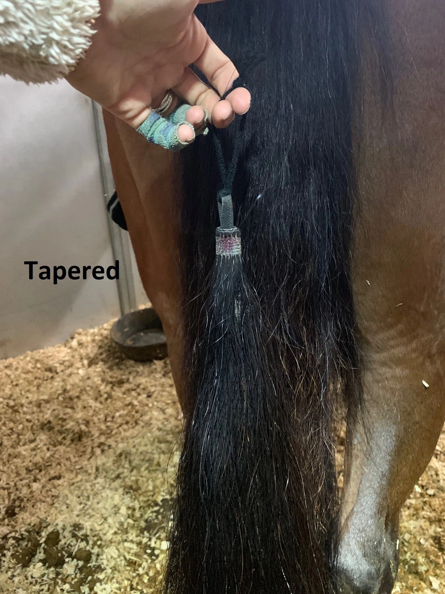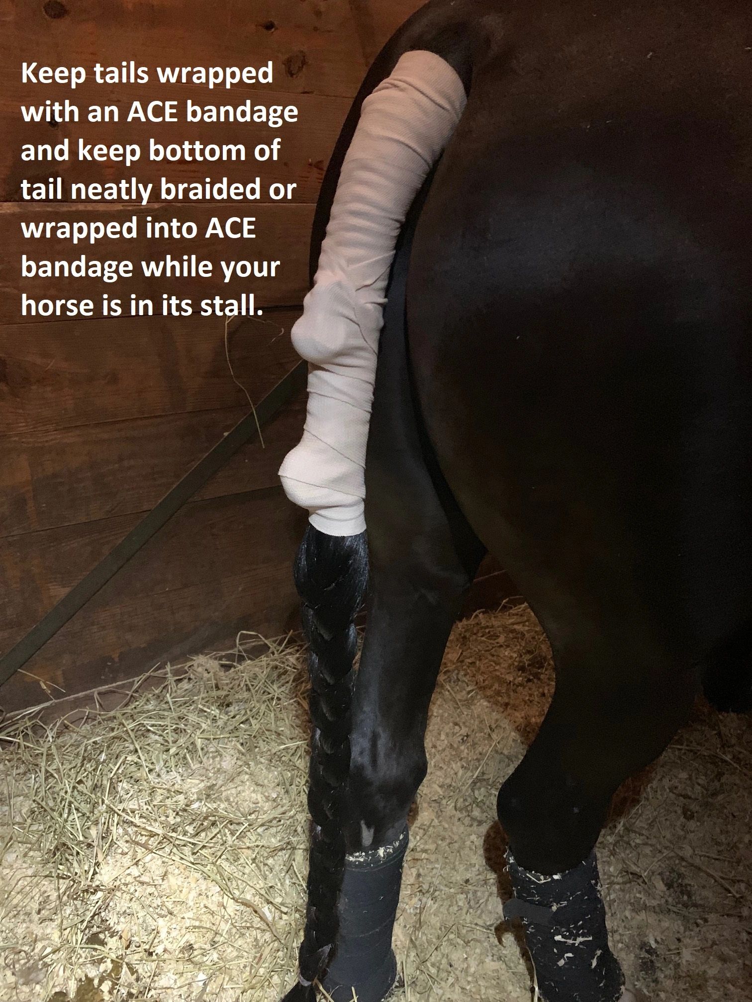 Always ALWAYS keep a completed tail wrapped up while your horse/pony is in their stall. Wrap the dock of the tail to keep the braid neat and clean, and either braid the rest of the tail down or wrap the rest of the tail into the ACE bandage to keep it from getting stepping on if your horse/pony decides to lay down.