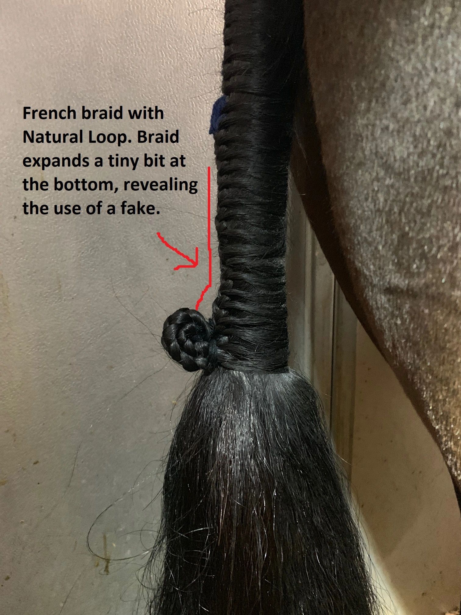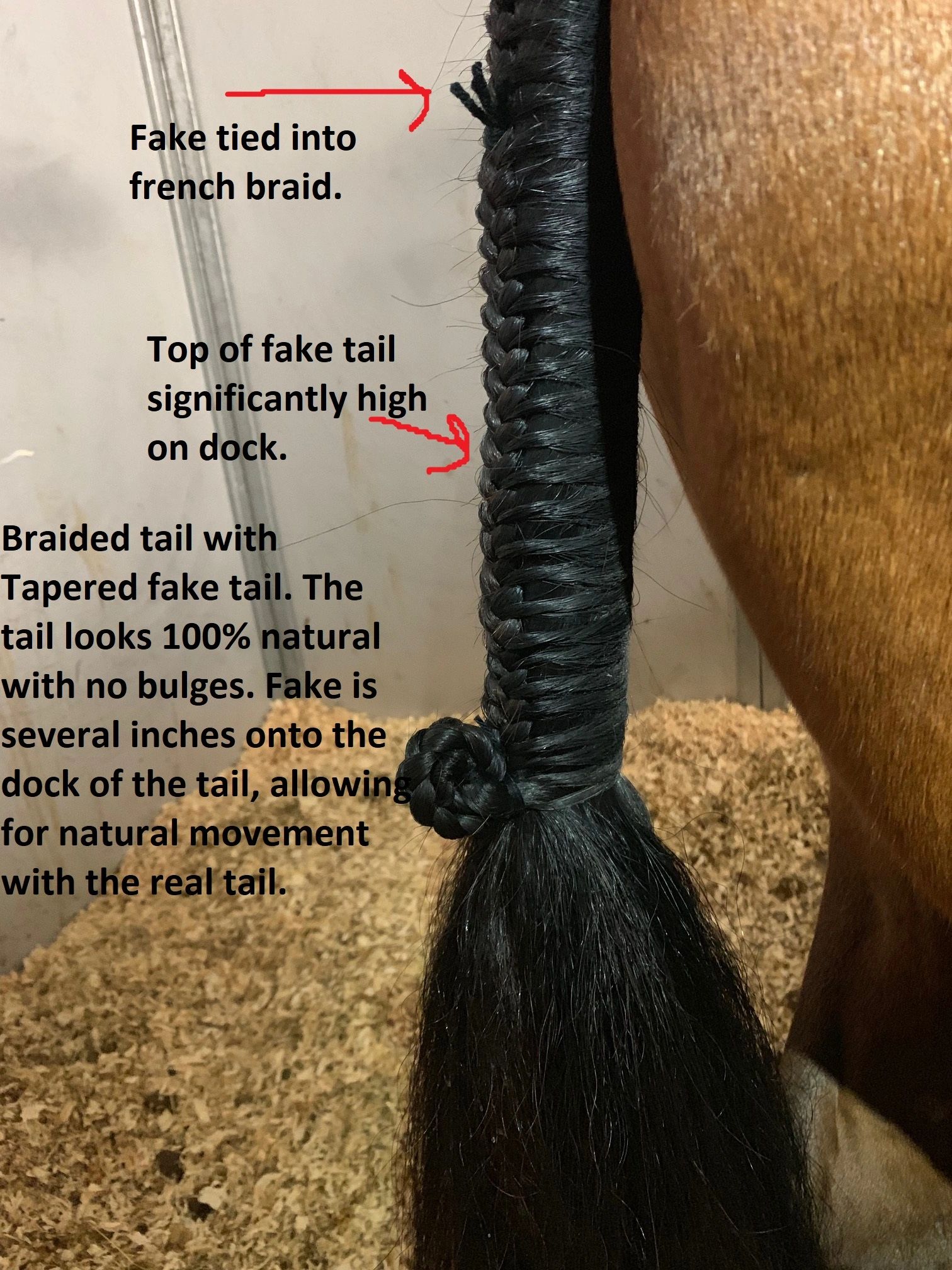 The point of a fake tail is adding thickness and volume to your mounts flowing tail without making it look altered in any way. This is where purchasing the correct length of tail comes into play (it is very important). When deciding where to insert the fake tail, you want to focus on the actual DOCK of the tail – not the bottom of the tail! You want the top of the fake tail to be braided between 1-6 inches INSIDE the French braid – in other words, you want a good bit of the fake tail to be CONNECTED to the actual dock of the tail. This ensures that the fake tail will move naturally with the rest of the flowing tail beneath your French braid. If the fake tail hangs BELOW the dock of the tail (in attempt to match the bottom of the fake with the bottom of the real tail) and out of the French braid, the fake will move in opposite directions from the actual tail – this makes for a huge distraction and is quite unpleasant. Matching the fake with the dock is more important than matching with the length of the real tail. The real tail grows every day and may change length from show to show. As crazy a it may sound, it IS okay to trim the real tail!!!!